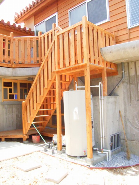 玉那覇邸は、沖縄県与那原町の敷地面積335㎡延べ床面積147㎡規模の住宅である。建て主夫妻とその子供2名及び高齢者1名の3世代5人家族が居住する。敷地は町中であるが、ガジュマルやデイゴの木が茂る町の広場に隣接し、ハイビスカスの生垣で街並みの緑の連続性が考えられたものとなっている。住宅はRC造一部木造で、意匠的には沖縄の伝統的な木造住宅とし、木造の弱点である床下の湿気対策をコンクリートのベタ基礎と高床式のRC造として、2階部分を在来の軸組広報の木造としている。