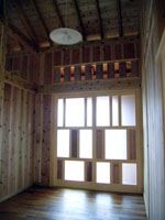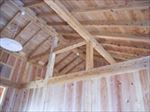 2重垂木の構造で屋根断熱を十分にとり(2枚の野地板の間に断熱材を挟みこむ)、天井を張らず、小屋の中を空気がめぐるようにする。