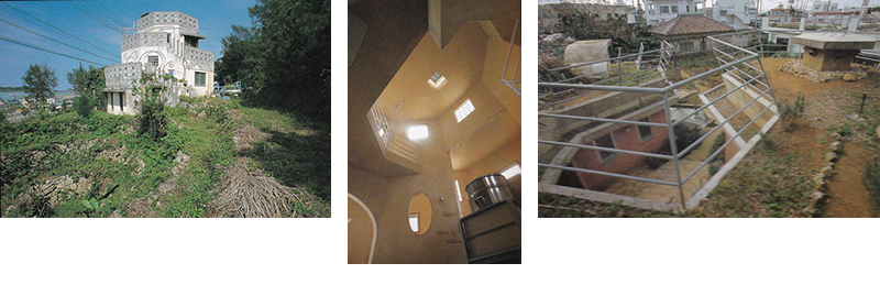 「海の家」、「山の家」の住宅計画は、陽の巡りをテーマに名護市内の東の山辺と西の海辺に位置する二つの家を、陽の巡る時刻の移動に合わせて、一対の関係を結ぶ兄弟のように計画した。屋根の断熱材として近くの浜辺から拾い集めたサンゴ石を使った。床下を深くとった高床が自然換気の装置を備えていて、無双式の小窓で各室と外をつないでいる。
